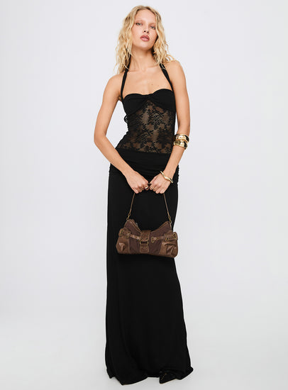 - Pinched bust, sheer bodice, side ruching detail, adjustable halter straps, open back, fixed strap back detail