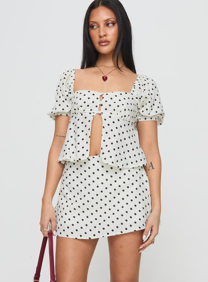- Polka dot print, linen blend material, invisible zip fastening at side, relaxed fitting, split hem at side