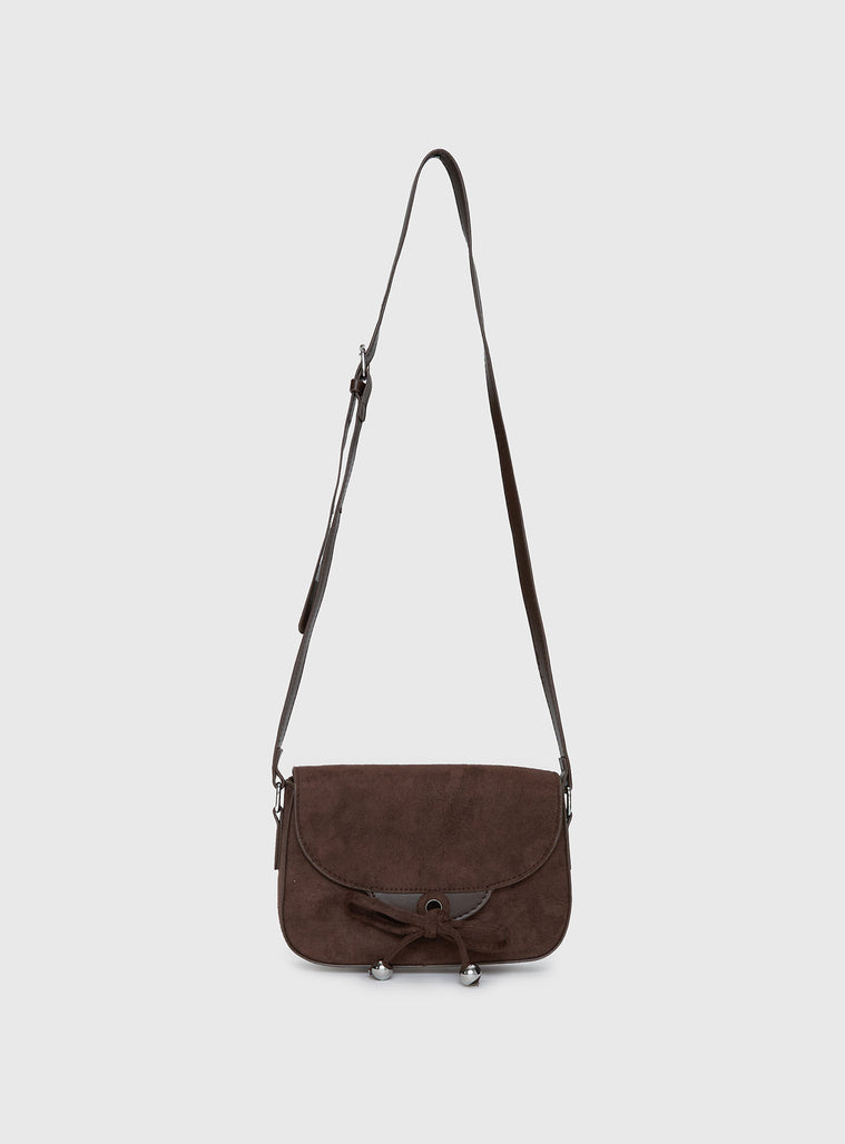 - Bow detail with bead detail, silver-toned hardware, snap button closure, one main compartment with internal pocket, adjustable straps, flat base