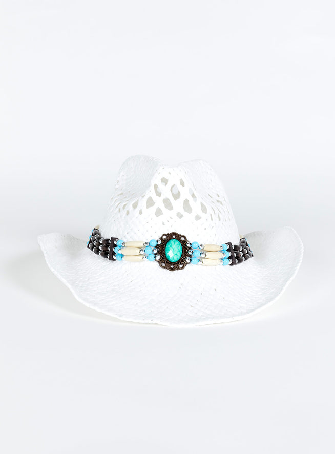 Cowboy hat Woven straw Curved wide brim  Internal adjustable drawstring Mouldable brim shape Bead detail