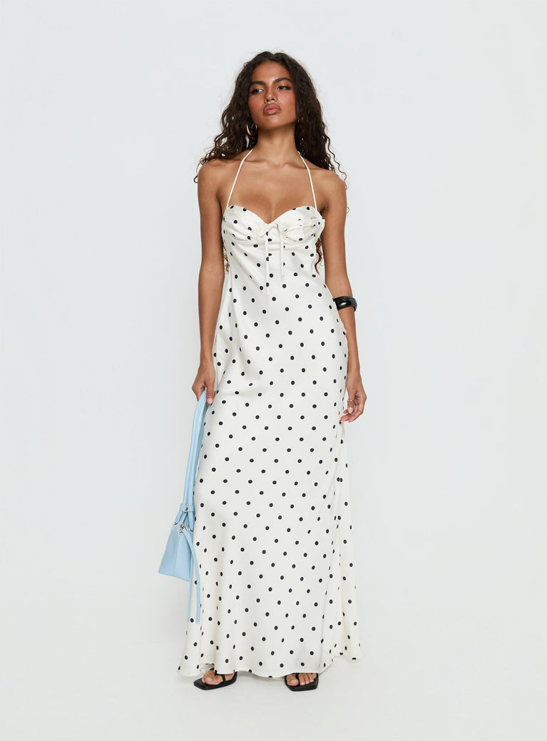 - Polka-dot print, pleated bust, underwire, silicon strip, zip closure at side, low back