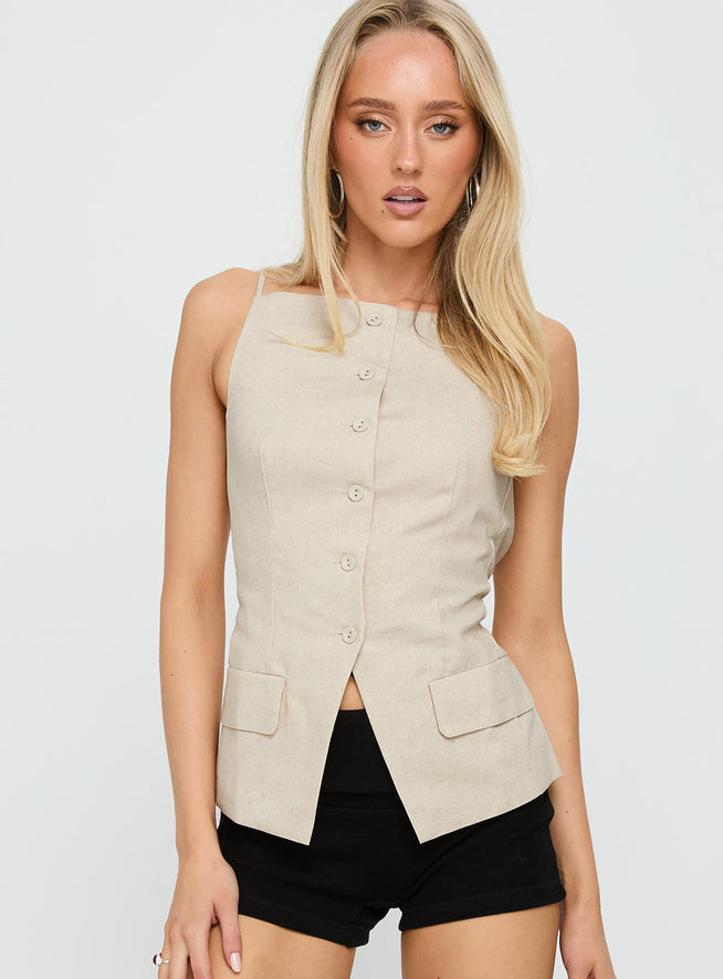 - Linen blend material, high neckline, split hem, faux front pockets, tie fastening at back