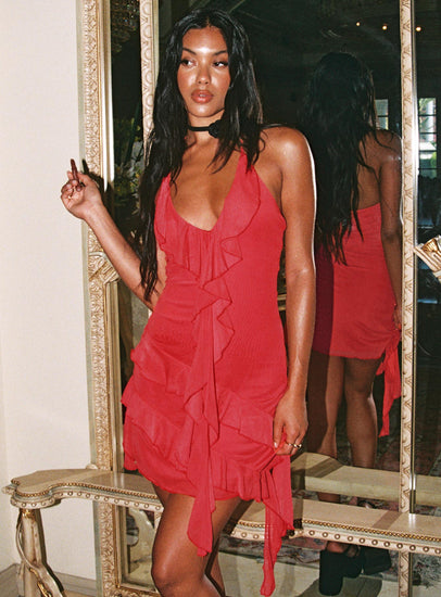 Fig Ruffle Mini Dress Red has a rating of 4.8 stars based on 28 reviews.