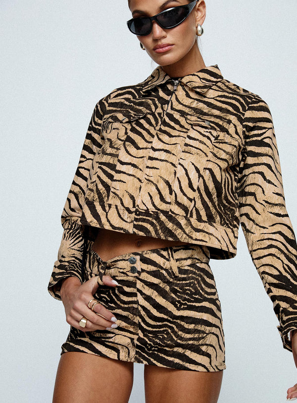 - Multi-print, collared, twin breast pockets with button closure, zip closure, double-button cuff