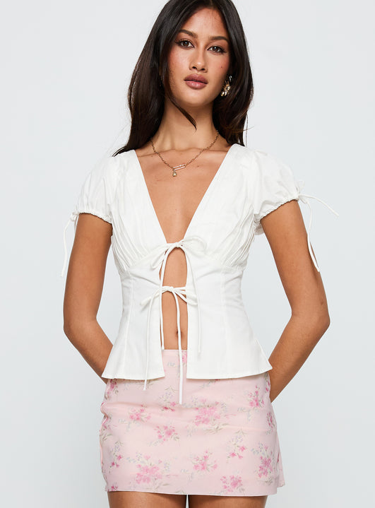 - V-neckline, ruched bust, twin tie closure, puff sleeves