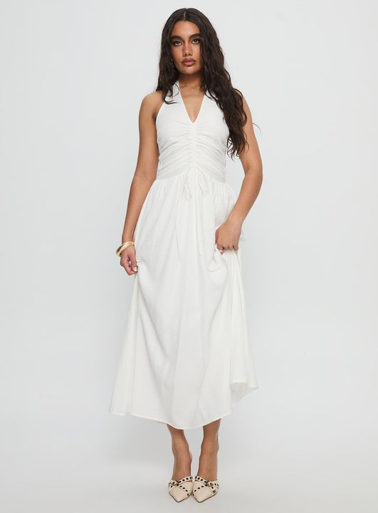 - V-neckline, front tie detail, soft pleats along waist, elasticated halter strap, partially open back, shirred back detail