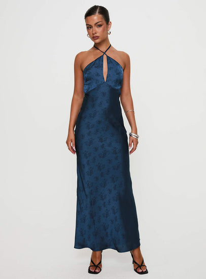 - Floral detail, high neck, cut-out at front, invisible zip closure on side, adjustable halter straps, open back back tie detail