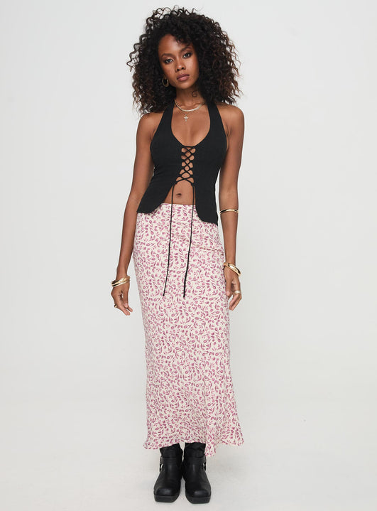 front view of model wearing Princess Polly Mariposa Maxi Skirt Beige Floral Maxi