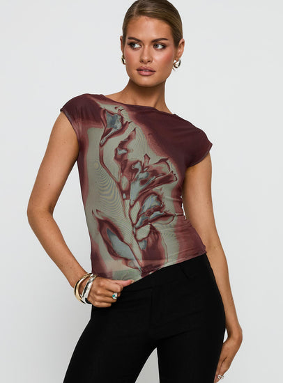 side view of model wearing Princess Polly Nova Top Brown Short Sleeves Boat Neck