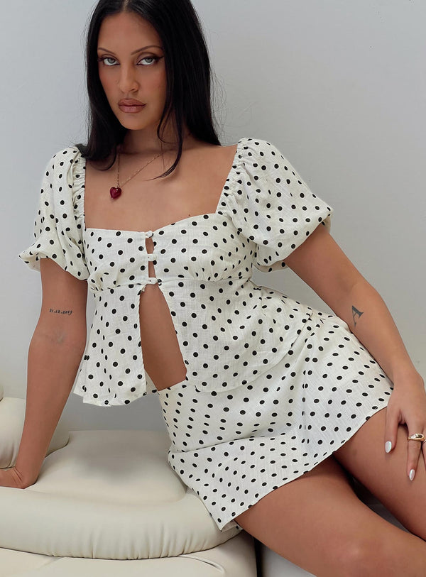 - Puff sleeve, square neckline, button fastening down front, split hem