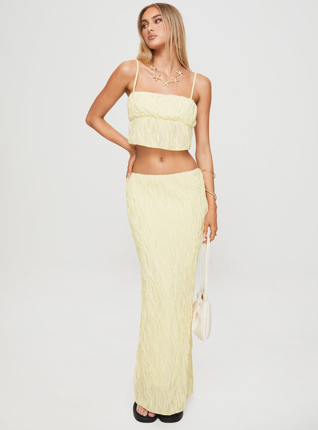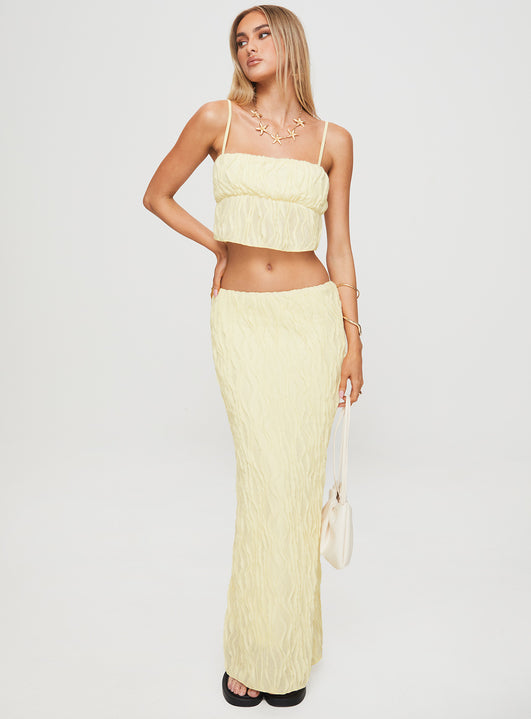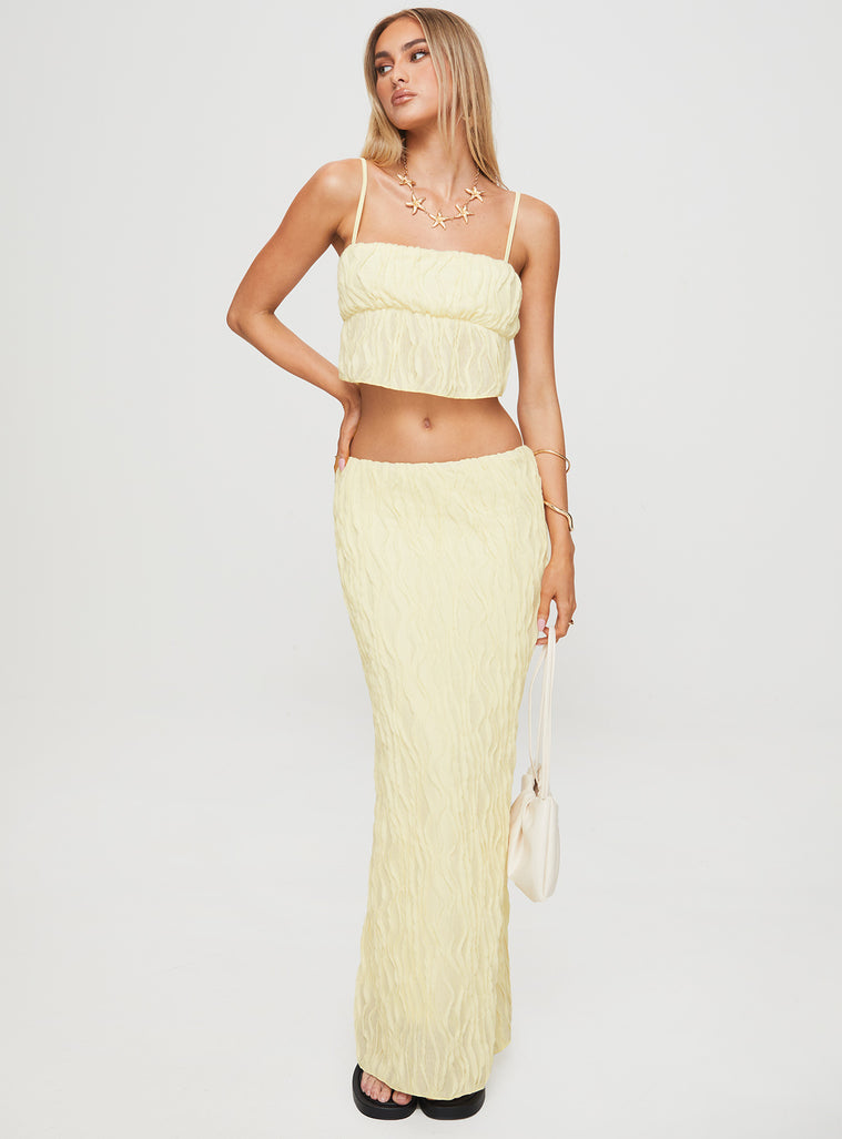 - Cropped top, straight neckline, adjustable straps, low-rise maxi skirt, elasticated waistband