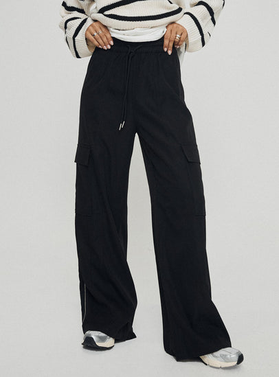 - Wide-leg, four-pocket cargo design, zip fastening at side seam hem, elasticated drawstring at waist