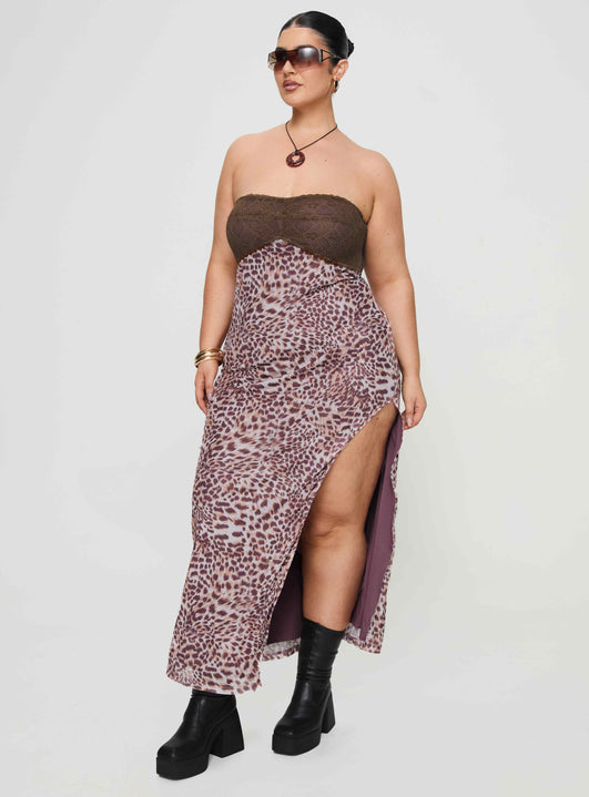 - Inner silicone strip at bust, lace detail, zip fastening down back, slit at leg