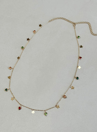 Chain belt Gold toned Drop charms Gemstone and butterfly detail