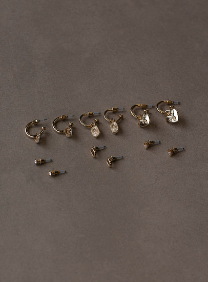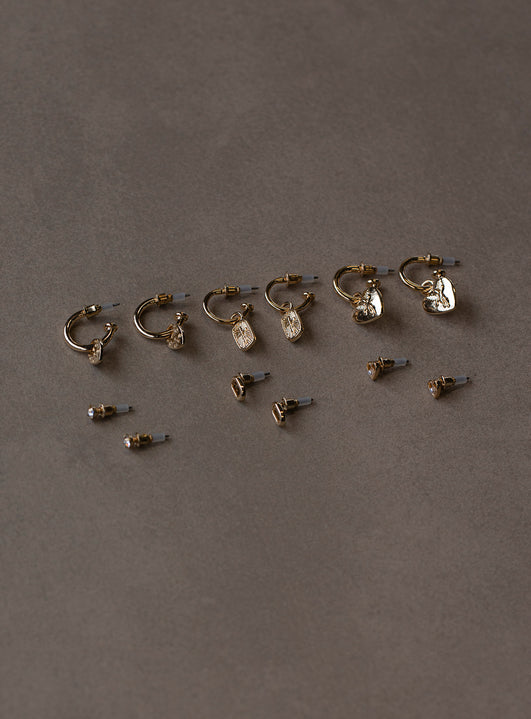 Gold Earrings Pack of six  Three hoop styles  Three stud styles  Drop charms