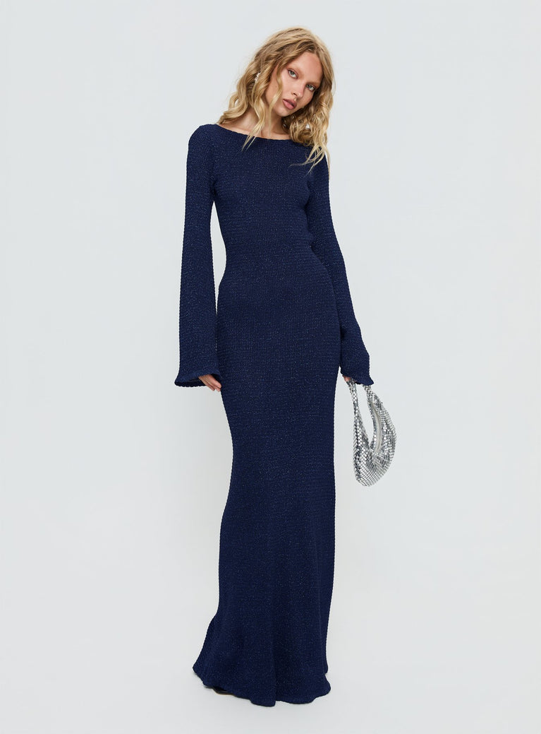 - Glitter detail, boat neckline, scalloped trim, flared sleeves, backless