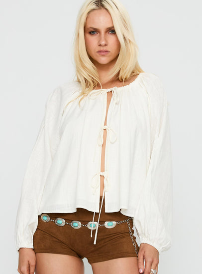 - Long sleeve, split hem, triple tie fastening, elasticated cuffs, puffs sleeves, adjustable round neckline