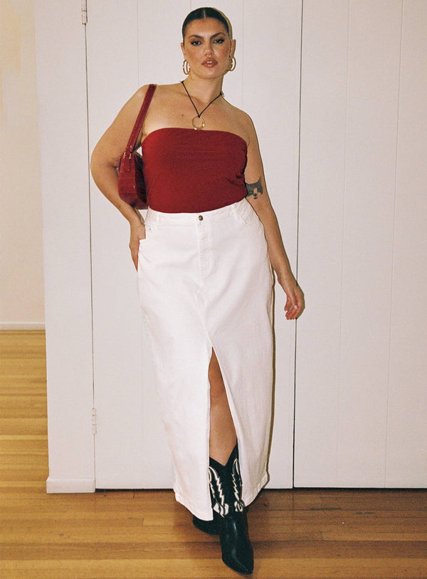 front view of model wearing Princess Polly Strutter Strapless Top Burgundy Curve Sleeveless Square Neck