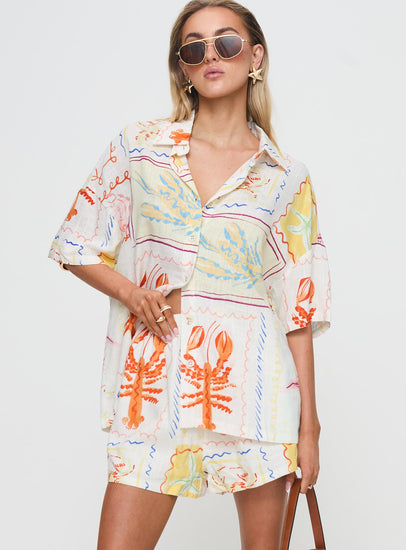 - Classic collar, button-up closure, drop shoulders, mid-rise fit shorts, elasticated waistband, twin hip pockets, oversized